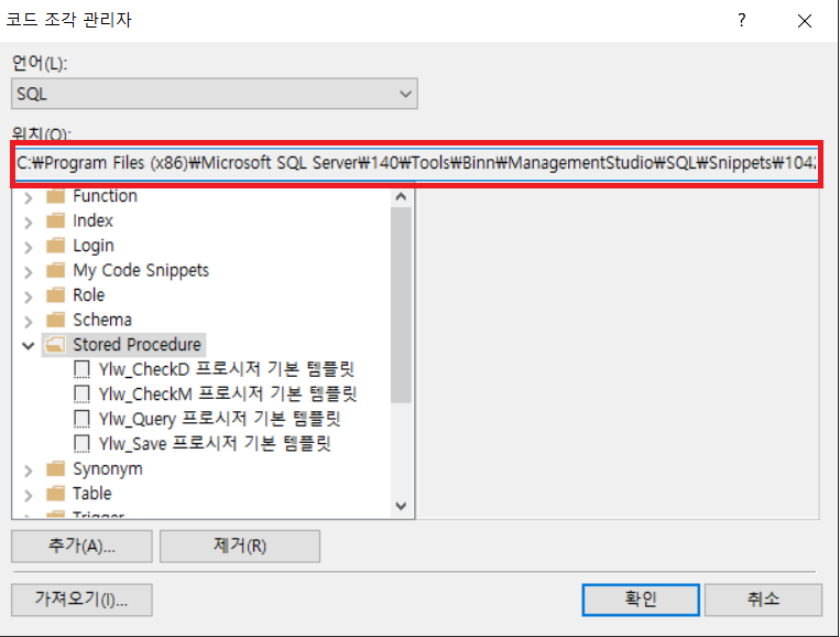 이 방식으로 해보니 SSMS를 끄고 다시 킬 시 텍스트 입력기에서 해당 코드 조각 삽입 폴더가 표시가 안되는 문제가 있었습니다...