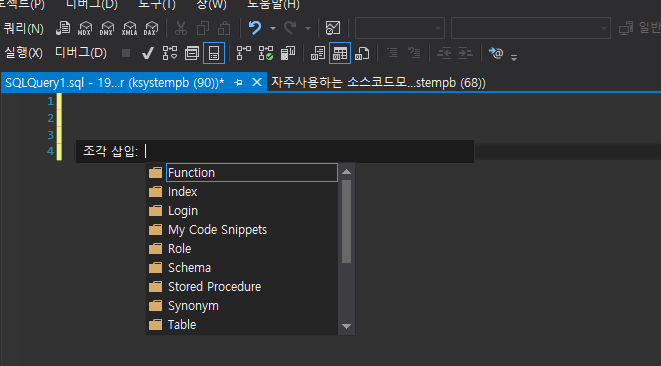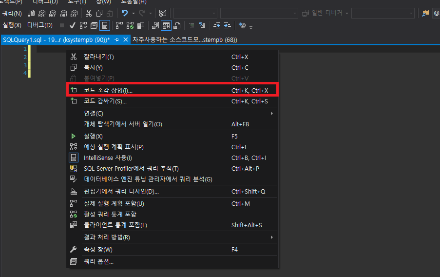 코드 조각관리자는 SSMS에서 제공하는 기능으로 미리 정의된 코드 조각을 삽입하거나 고유의 코드 조각을 만들 수 있도록 도와줍니다.