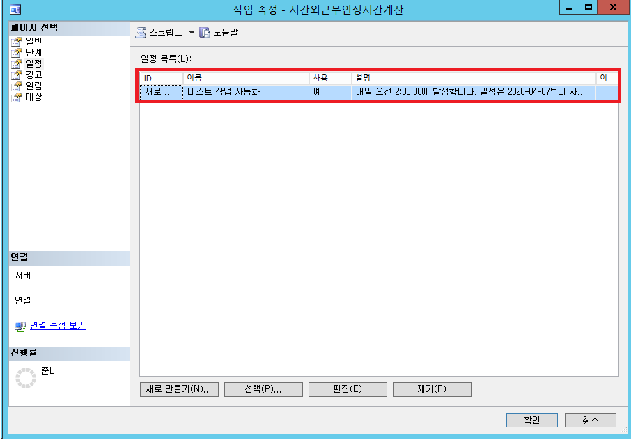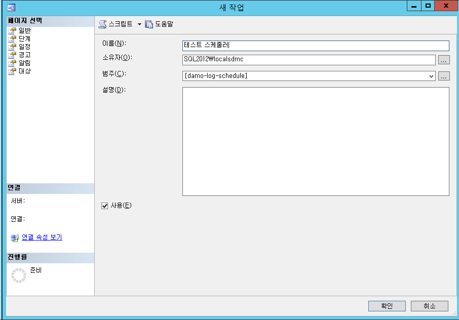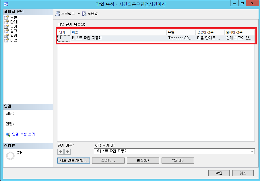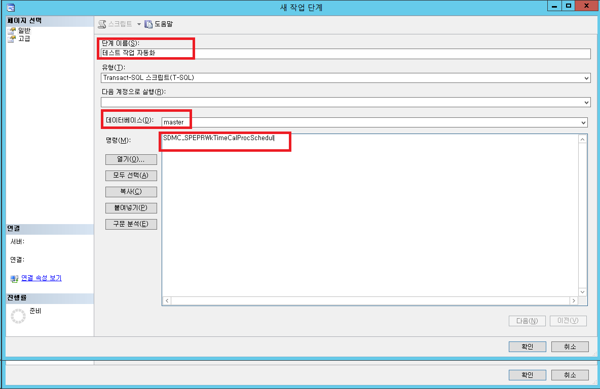 해당 작업 단계 이름 / 데이터베이스/ 명령을 실행할 쿼리문을 입력한뒤 확인을 누릅니다.