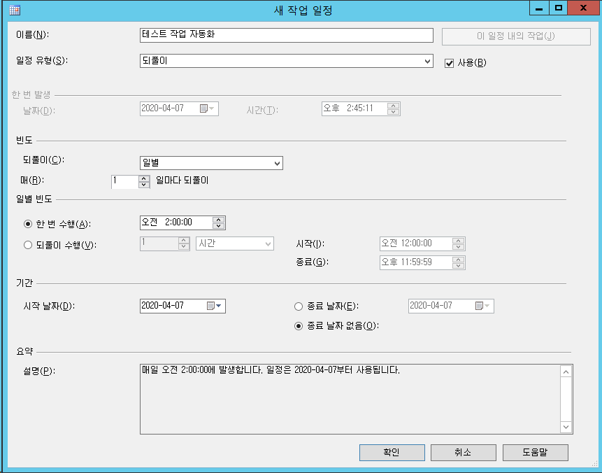 이제 작업 일정을 설정하시면 됩니다. 빈도 및 기간을 설정하시고 확인을 눌러줍니다.