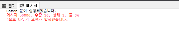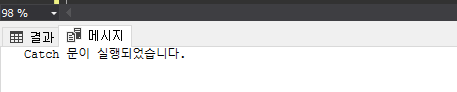 또한 위에 Catch 문에서 사용한 이 SQL문은 Try Catch는 오류에 대해 전적으로 사용자에게 처리를 맡기기 때문에 해당 구문으로 메시지를 표시하지 않는다면 따로 결과창에 표시가 되지 않습니다.