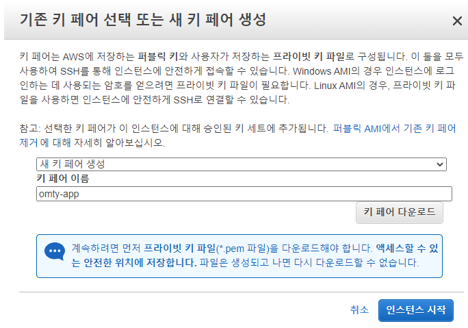 인스턴스를 시작할 경우 키 페어를 생성해야합니다. 키페어는 내 인스턴스에 접근할 수 있는 열쇠이고 노출되거나 잃어버리면 안되기 때문에 꼭 주의하셔야합니다.