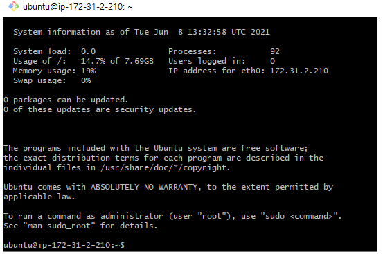 실행하시면 아래 그림처럼 ubuntu에 해당 인스턴스로 연결이 됩니다.
