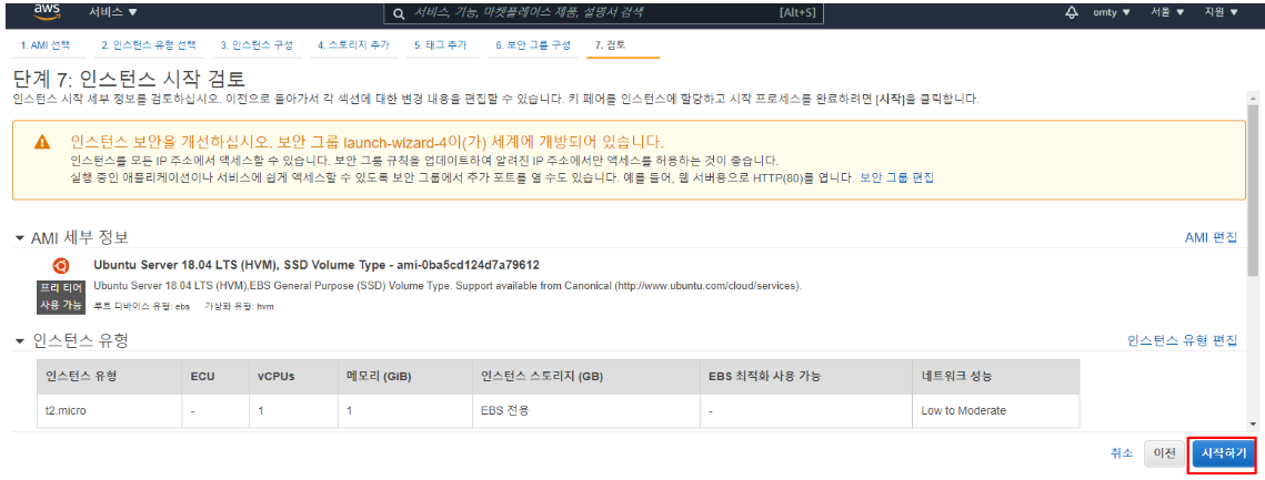 인스턴스 유형도 마찬가지로 프리티어 선택 후 검토 및 시작을 클릭해줍니다.