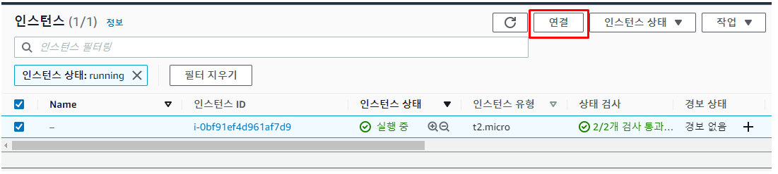 실행중인 인스턴스를 선택한 후 연결을 클릭하면