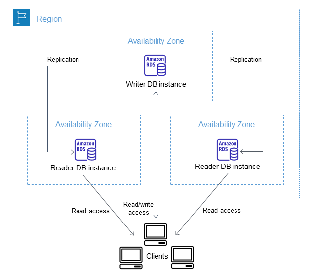 다중 AZ DB에는 하나의 라이터 인스턴스는 읽기/쓰기의 작업이 가능하며 리더 엔드포인트는 읽기 작업만 가능하다. 여기서 클러스터, 리더 엔드포인트란 DB 인스턴스를 직접 가리키는 것이 아닌 추상화된 연결이다. 해당 연결정보를 통해 인스턴스로 접근이 가능한 중간 핸들러 역할로 실제 DB 인스턴스에 장애가 발생할 경우 자동으로 연결된 인스턴스를 변경한다. DB 클러스터의 기본 DB 인스턴스에 장애가 발생하면 자동으로 새로운 DB 인스턴스로 장애를 조치하는데 기존의 리더 인스턴스를 라이터 인스턴스로 승격하여 이를 수행한다. 이 때 리더 인스턴스의 장애 상황에도 새로운 라이터 인스턴스로 승격이 이루어진다. 장애 조치가 발생하면 기존의 연결을 재구성 할 필요없이 기존의 엔드포인트를 통해 승격된 라이터 인스턴스로 접근이 가능하다. 이 때 짧은 시간동안(초단위) 연결이 중단되지만 상당히 빠른 시간안에 복구가 가능하며 이후 별도의 조치 없이 서비스가 가능하다.