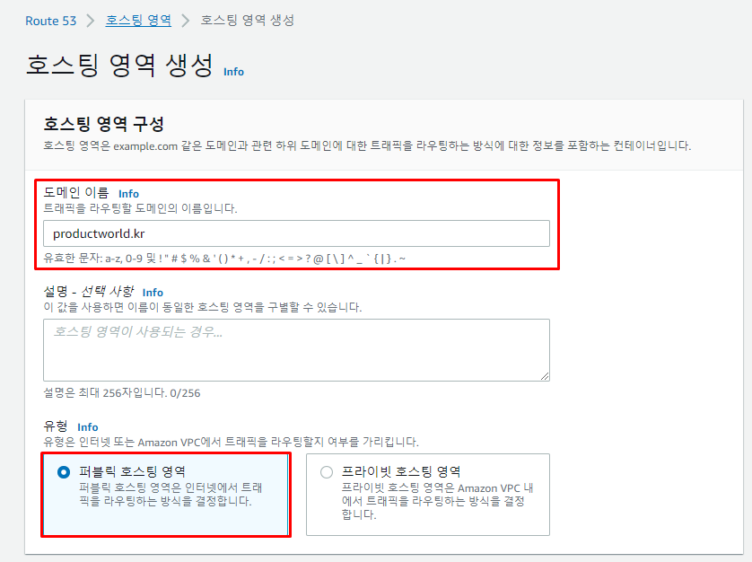AWS Route53 > 호스팅 영역에서 구입하신 도메인을 입력하고 저는 외부에서 접근이 가능하도록 퍼블릭 유형으로 설정했습니다.