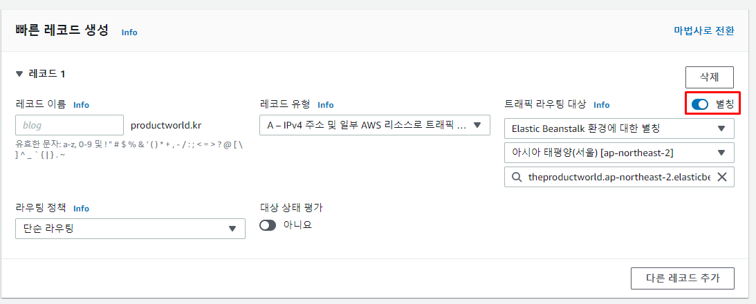 호스팅 영역 > 레코드 생성해서 레코드 이름은 비운채 레코드 유형 A, 별칭에 체크하면 AWS 서비스에 대해 선택이 가능합니다. 트래픽 라우팅 대상은 EB, 리전은 서울, 그리고 EB 환경을 선택한 후 등록해 줍니다.