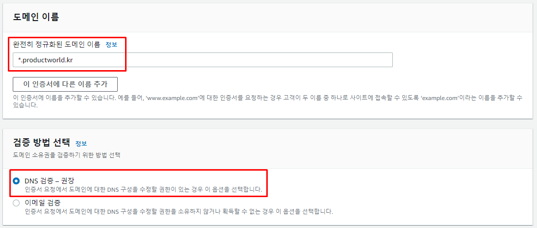 구입한 도메인 이름을 적은 후 DNS 검증을 선택합니다.