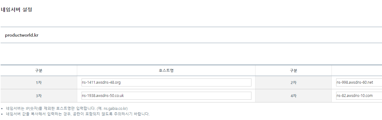 네임 서버 설정에서 유형 NS의 4개의 값을 1,2,3,4 차에 넣어줍니다.