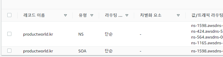 이후 레코드 유형 NS, SOA로 생성이 된 것을 확인할 수 있습니다.