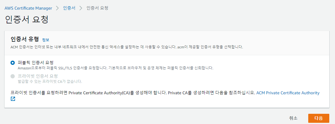 요청에서 퍼블릭 인증서를 선택한 후 다음을 클릭합니다.