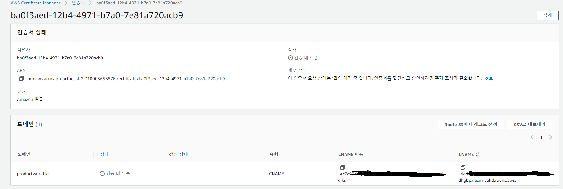 검증이 완료되기 위해서는 위에서 말씀드린 CNAME 등록 절차가 필요합니다.