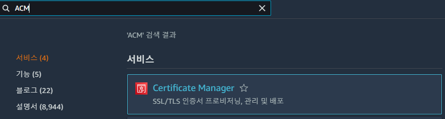 네임서버 등록이 되었다면 AWS로 넘어가서 ACM 서비스로 들어갑니다.