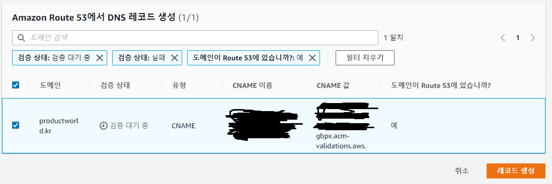 인증서로 들어가보시면 아래와 같이 CNAME 정보를 확인할 수 있습니다. 해당 페이지에서 Route 53에서 레코드 생성을 클릭합니다.