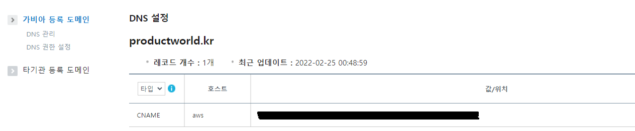 가비아에 DNS 설정에 들어가서 CNAME을 등록해줍니다.