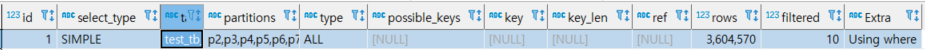 조건절을 member_id 만으로 실행할 경우 rows는 1건으로 동일하나 partitions 부분을 보면 전체 파티션을 스캔한 것을 확인할 수 있습니다.
