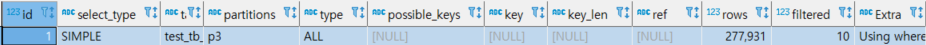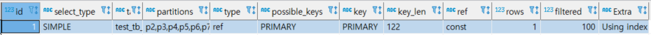 위의 예제에서 여러개의 파티션 중 데이터가 존재하는 파티션, 즉 필요한 파티션만 추출하는 기능을 파티션 프루닝이라고 합니다. 파티션 프루닝을 통해 전체 파티션에 접근하지 않고 필요한 파티션에만 접근할 수 있으며 Explain으로 확인해보면 partitions 컬럼에 어떤 파티션을 조회했는지 확인할 수 있습니다.