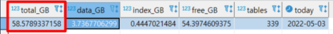 CloudWatch의 사용된 바이트는 약 143GB인데 INFORMATION_SCHEMA는 약 58GB 입니다.