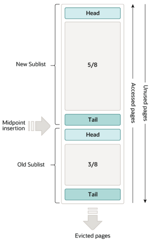 다만 MySQL의 구조는 조금 다릅니다. 버퍼 풀 리스트는 New, Old 서브 리스트로 나눠지며 각각 Head, Tail이 존재합니다. 그리고 New, Old 서브 리스트는 각각 5/8, 3/8 비율로 구성됩니다. 이때 New의 Tail과 Old의 Head가 만나는 지점을 MidPoint라 하며 이후 버퍼 풀에 새로운 페이지가 들어올 경우 중간 지점인 Old의 Head 부분에 저장됩니다.